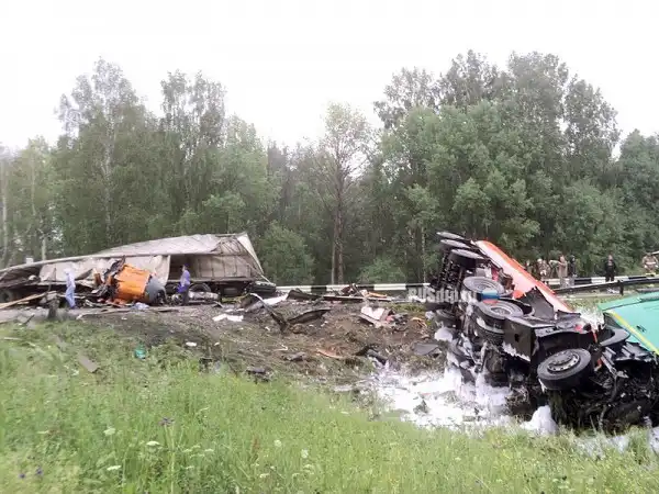 12 июля около 18:05 в Новосибирской области на 95 км трассы М-53 в Мошковском районе произошла крупная авария. 46-летний водитель тягача «Freightliner», перевозивший стальные трубы, при обгоне столкнулся с попутным автомобилем «Тойота Калдина» под управлением 28-летнего водителя, после чего фуру выбросило на встречную полосу под бензовоз «МАЗ», который перевозил 23 тонны нефтепродуктов.