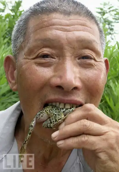 4. В 2007 году новостное агентство Beijing News сообщило, что шестидесятишестилетний Цзян Мушенг, (на фотографии), ел живых лягушек, мышей и крыс в течение сорока лет для того, чтобы оставаться здоровым. Цзян, который страдал от хронических болей в животе с молодости, узнав об этом варианте лечения в своей деревне в провинции Цзянси. Он утверждал, что после одного месяца глотания живых древесных лягушек его боли ушли и не возвращались, и с течением времени он добавил к своей диете живых мышей и крысят.