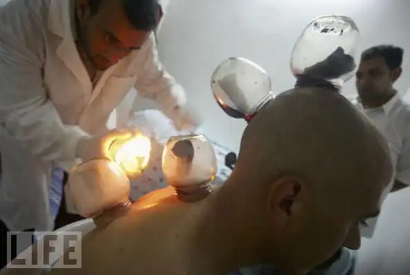 6. Мусульманское лечение банками. Пациент на фотографии проходит традиционное лечение «hijama», направленное на то, чтобы вылечить его головные боли. «Hijama», которое является сочетанием использования банок и кровопускания, считается терапией, которая была описана еще пророком Мухаммедом и используется во многих исламских странах для лечения хронической боли, ревматизма, экземы и других серьезных заболеваний. Процедура включает в себя применение специальных медицинских банок. Когда банка прикасается к телу больного, внутрь засасывается кожа. Это ведет к увеличению притока крови к данному участку. Банки активно стимулируют кровообращение, обновление клеток организма, улучшают обмен веществ. Затем производятся небольшие разрезы и снова накладывают банки. Таким образом из организма уходит «гнилая» кровь.