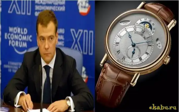 Третьим в рейтинге фигурирует действующий президент РФ Дмитрий Медведев, с хронометром швейцарской фирмы «Breguet». Модель часов Classique Moon Phase оценивается в девятьсот тысяч рублей. Очевидно, страсть к швейцарским часам этой фирмы у семьи Медведевых взаимная: хронометром этой же фирмы обладает и супруга президента Светлана. Стоимость – 900000 рублей.