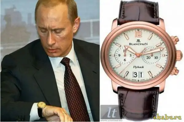 Пятая строчка принадлежит часам российского премьера Владимира Путина. Путин сверяет свое время по хронометру фирмы «Blancpain», модель Leman Aqualung Grande Date. Стоят эти часы относительно недорого – что-то около трехсот тысяч рублей. Впрочем, злые языки утверждают, что раньше Путин носил более дорогие часы, на «дешевый вариант» был вынужден перейти после того, как граждане стали выпрашивать премьерские часы себе в подарок. Счастливыми обладателями премьерских часов стали молодой чабан из Тувы, а также слесарь из города Тула. Стоимость – 300000 рублей.
