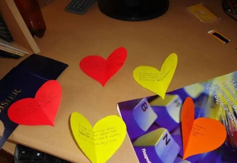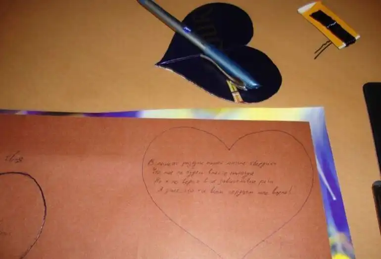 Да, смотрите чтобы стишок помещался в размеры сердца, а то придётся лепить слова и будет не красиво, для этого по-тренируйтесь в написании чтобы знать какого размера делать трафарет. И так, трафарет имеем, делаем пробу. Берём лист цветной бумаги такого цвета, который вы не будете использовать, так как это тока проба, прикладываем трафарет на бумагу, обводим, вырезаем, пишем стишок...