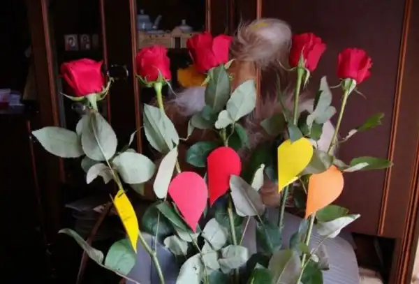 В общем, для подарка нам надо: цветы (в моём случае это розы), картон, цветная бумага, ножницы, простые заколки, ручка и либо способности к сочинению либо интернет. Мы будем делать открытки в которых мы будем писать то что хотим сказать, желательно в стихах, так как эффекта больше, и прикреплять их к цветам.