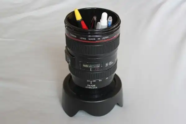 Самая простая из представленных в коллекции сувениров — кружка объектив Canon 24-105 первого поколения. Изготовленная из легкого пищевого пластика, она может быть использована как стакан для напитков или подставка для канцелярских принадлежностей на вашем письменном столе. Несмотря на свою сравнительно невысокую стоимость, кружка в форме объектива воспроизводит все детали прототипа.