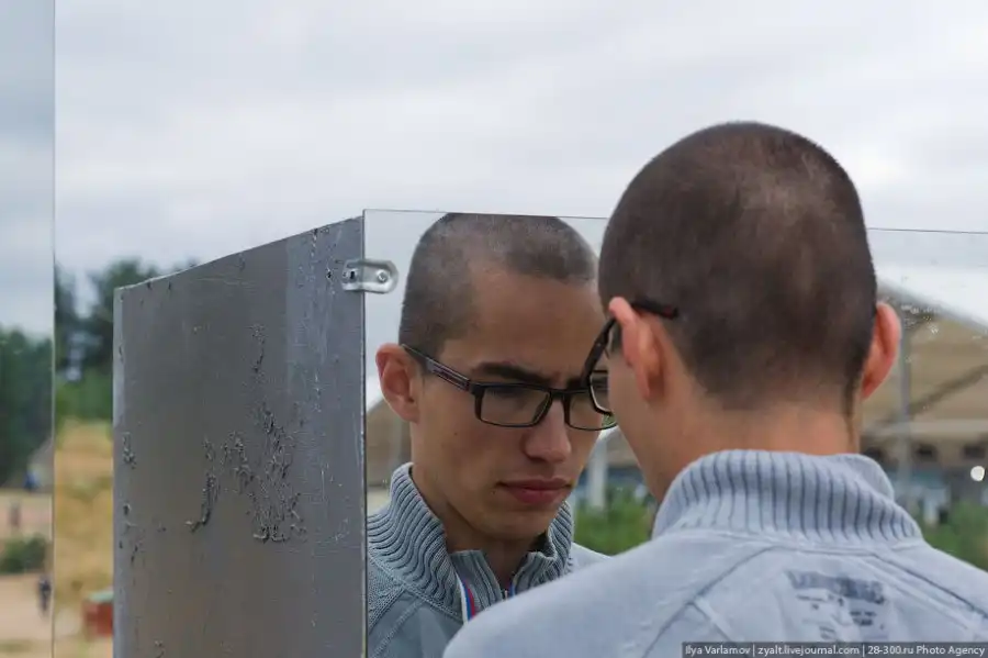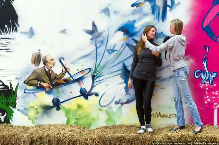 Большинство инсталляций посвящены Путину. Здесь, например, можно увидеть о ком думает премьер. Девушки используют этот агитящик просто как зеркало.