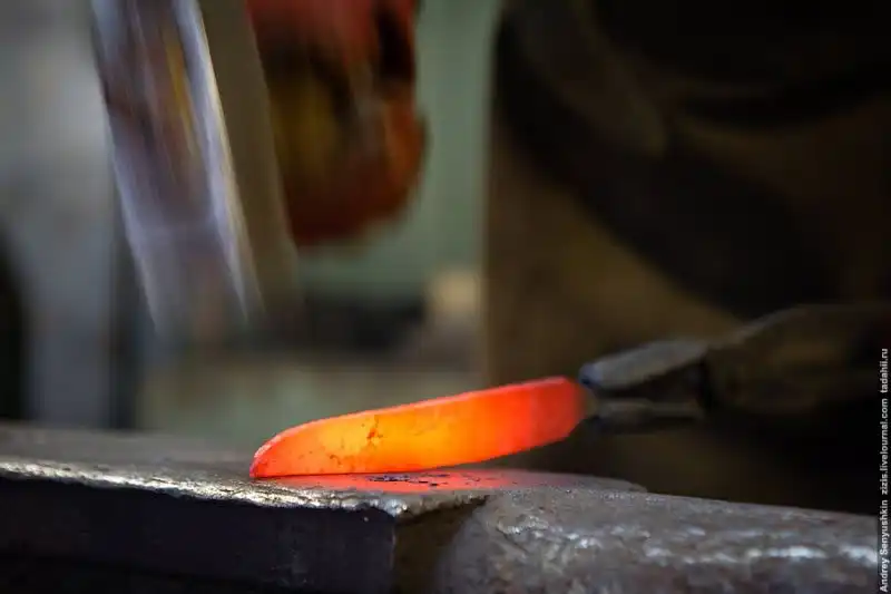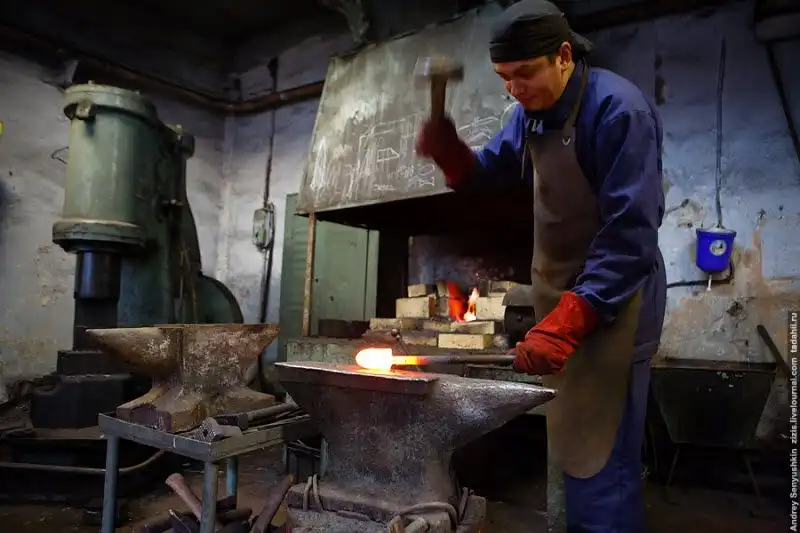 На помощь современным кузнецам приходит кузнечный молот. Во времена Аносова, крестного отца российского булата, это были огромные паровые махины. Почти как паровозы, только громче. Сейчас у кузнецов в почете оставшиеся после ликвидации советских заводов пневматические молоты. Не так будоражащие воображение, как паровые, но не менее производительные.