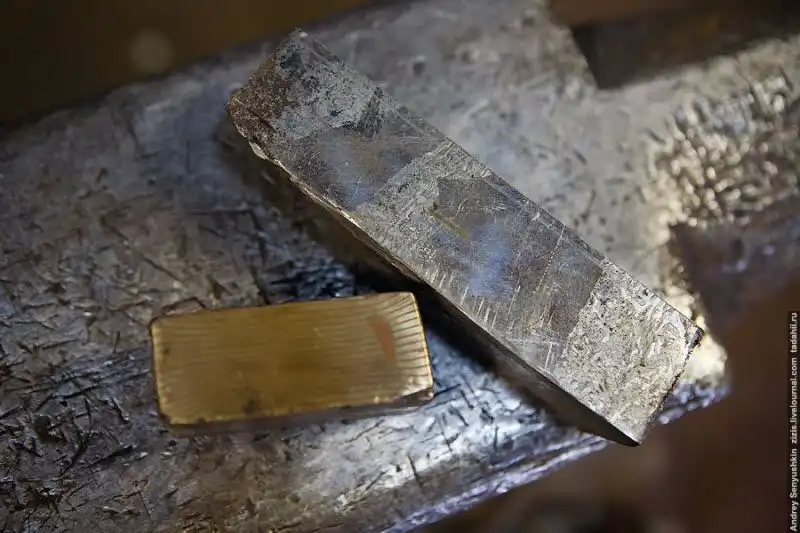 Во время варки важна любая мелочь, сплав должен свариться, но не быть передержаным на огне, соль и перец по вкусу. Дальнейшие действия зависят от предпочтения мастера. Кто-то предпочитает расковывать весь слиток, кто-то режет его вдоль или поперек, от этого будет зависеть будущий рисунок и прочность клинка. Илья предпочитает резать на четыре части, как апельсин.