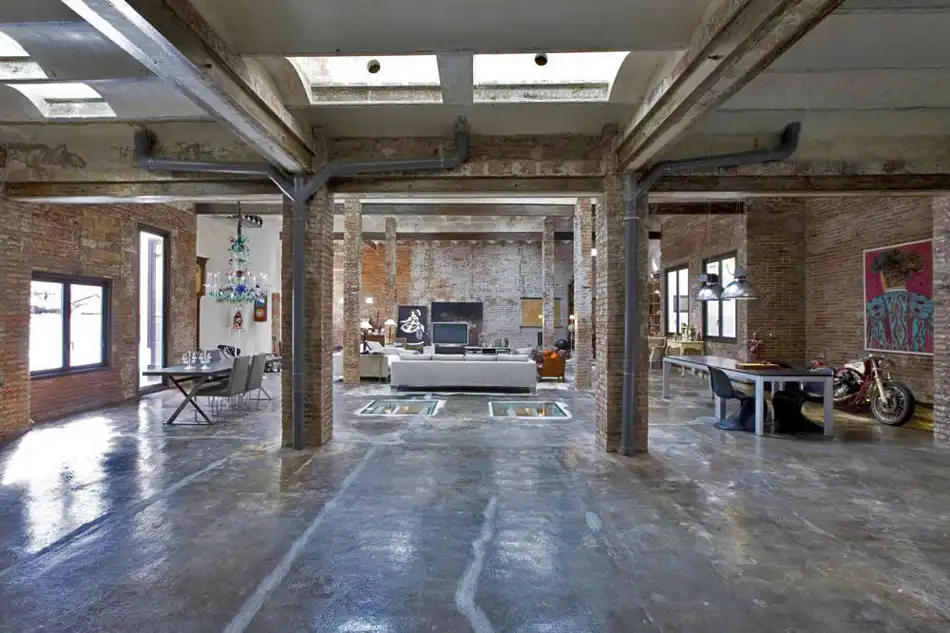 Классический для такого рода помещений интерьер с гордо представленными напоказ кирпичными стенами и высокими потолками тут сочетается с легкой светлой гаммой оформления определенных комнат.