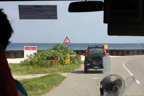 Дорога идет по периметру острова у края взлетно-посадочной полосы и при взлете-посадке самолетов проезд перекрывается: