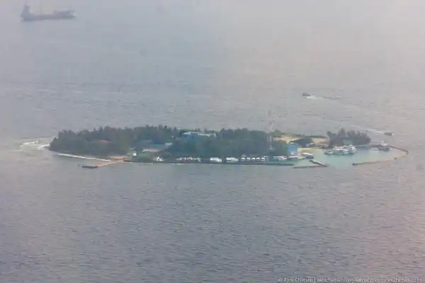дивах"... да, не был, но отлично себе представляю, что заплатив достаточно много денеге я получу тот же белоснежный пляж с колючим дном из битых кораллов, банальные пальмы, палящее солнце, скучный бассейн, сомнительный снорклинг в виде хоть какого-нибудь развлечения. Остров маленький, на нем нет ничего кроме белого песка, пальм и бирюзового моря. А друзья будут охать потом... "ты был на Мальдивах" )) В общем мой итог такой - мир настолько интересный и разнообразный, что пробовать все стоит, но вот боготворить раскрученный бренд "райских мальдив", врядли. Мальдвы сверху красиво снять не удалось, так как вылет был вечерний и солнце уже было достаточно низко для хорошей аэрофотосъемки: