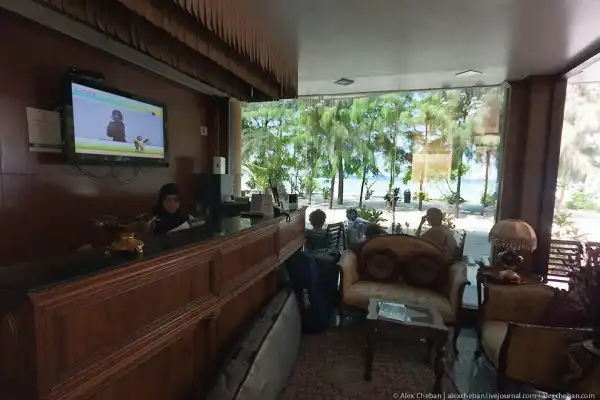 Ресепшн отеля "Fuanna Inn" на острове Хулхумале, где мы обедали, номер в нем стоит 50 долларов, отличный обед на терассе на крыше всего 6 долларов1