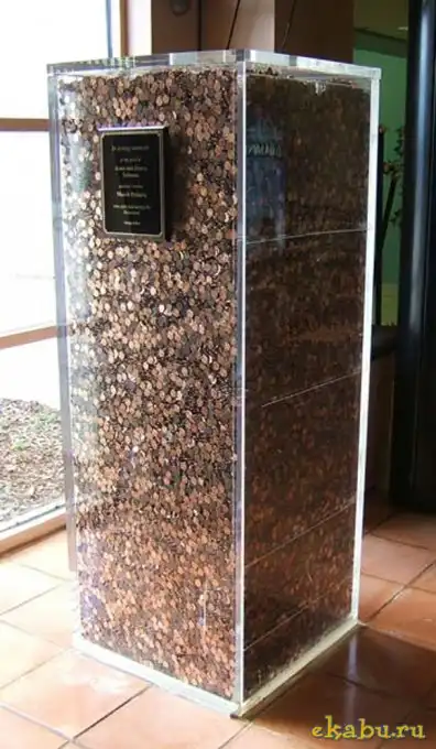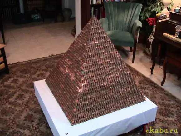 Данная пирамида, построенная из 289318 монет, побила прежний мировой рекорд. Строитель пирамиды продолжает докладывать монетки, и говорят, что количество монет увеличилось до 403135 штук.