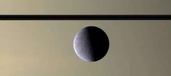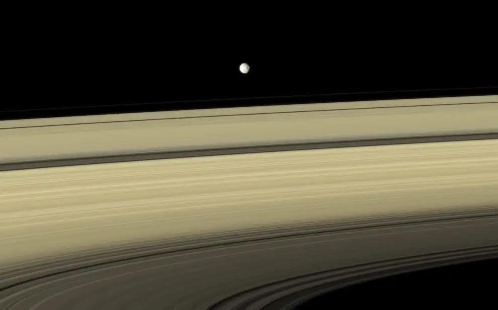 Мимас отбрасывает тень на кольца Сатурна: