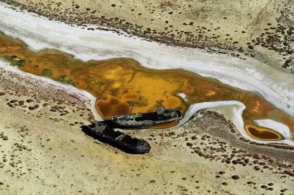 Лодки стали на мель на высохщем побережье Аральского моря, Казахстан