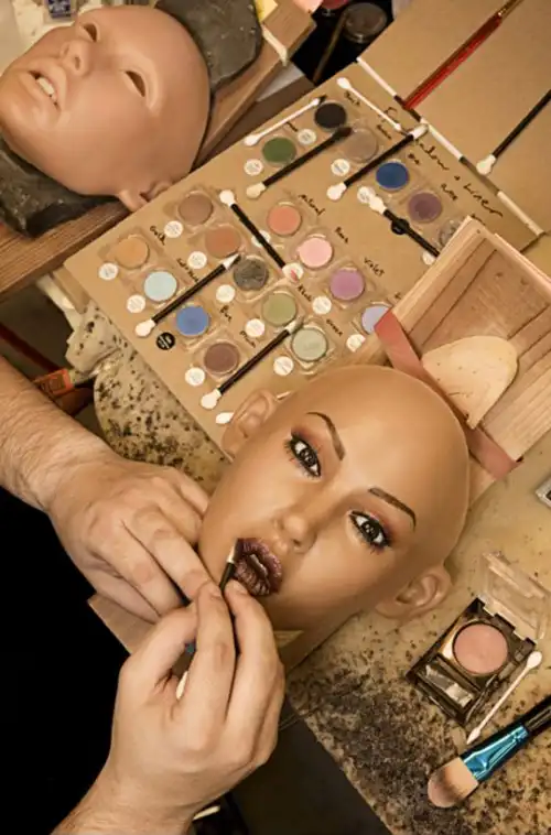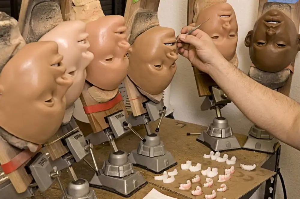 Стилист Дерек Транк, работающий в компании уже два года, красит кукле глаза. Он говорит, что на создание лица уходит около недели. Зубы и десны также делаются из силикона.