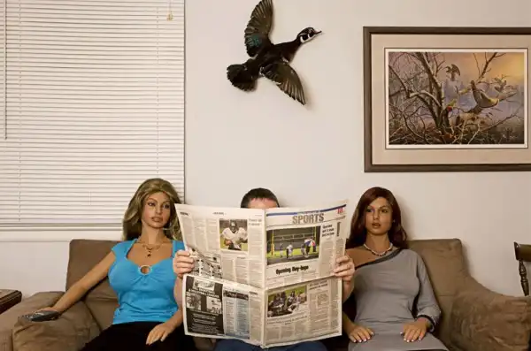 Си Ди Джей и его жена Си – живое доказательство, что силиконовая кукла и семейная жизнь вполне совместимы. Си – милая женщина за 30, она познакомилась со своим мужем в интернете, и они поженились на круизном лайнере по пути на Багамы. Она не ревнует своего мужа к Сэнди – сексапильной кукле с идеальной фигурой, если только кукла не ложится на их супружеском ложе. Дома у Сэнди есть собственная спальня. У нее также огромный шкаф, набитый одеждой и сексуальными туфельками, где она проводит время, когда не лежит на кровати в такой позе, как на этом фото.