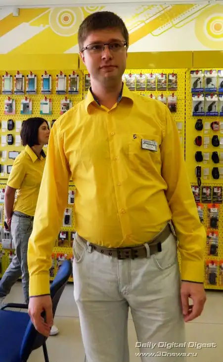 Надев желтую рубашку, я почувствовал себя немного Незнайкой, но коллеги заверили, что цвет мне к лицу. Действительно, он радует глаз и, кажется, молодит. Корпоративный стандарт — желтый верх в сочетании с темным низом, причем если рубашку тебе предоставляет компания, то брюки и обувь надо приобретать самостоятельно. К стажерам требования помягче, и меня выпускают в зал в почти белых джинсах и кроссовках.