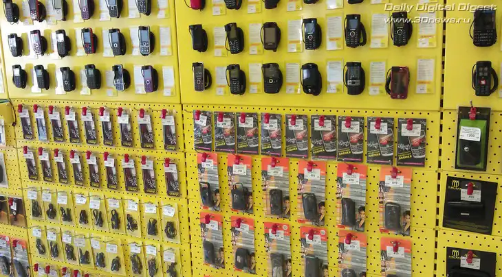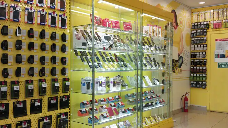 Недорогие телефоны можно потрогать самостоятельно. Рядом расположились дешевые аксессуары, от наушников до чехольчиков