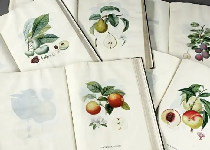 Трактат о плодовых деревьях французского физика, химика, агронома, члена Академии наук Анри Луи Дюамель дю Монсо (1700-1782). В книге собраны и подытожены его почти тридцатилетние наблюдения и эксперименты с фруктовыми деревьями. Великолепно оформленный двухтомник с иллюстрациями целого ряда известных художников того времени, изображающими 16 видов фруктовых деревьев, их плоды, листья, семена, фрукты. Данный экземпляр книги был в свое время закуплен в личную библиотеку короля Людовика XV, для чего был отпечатан в особенно роскошном виде, с золоченой обложкой.