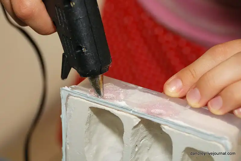 7. Чтобы упростить процесс вынимания отливки из коробки и не допустить вытекание гипса через уже сделанные отверстия, выложил дно коробки пищевой плёнкой.