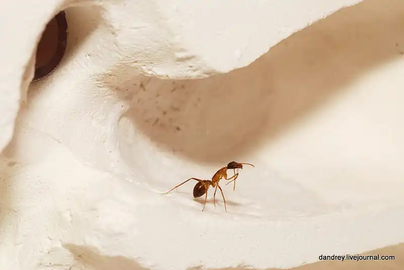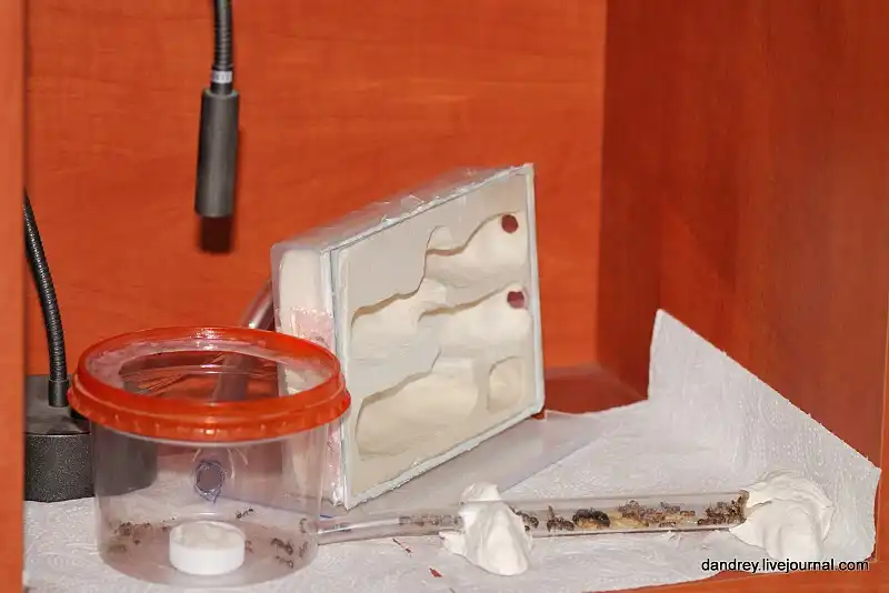 Итак, в пробирке нам стало тесновато. Camponotus fellah муравьи довольно крупные. Рабочие около сантиметра в длину, а мамашка и солдаты раза в два крупнее. Более сорока рабочих с приплодом уже с трудом помещались в пробирке и я решился на строительство формикария (искусственного муравейника). Принцип прост - наливай да пей нужно отлить из гипса или алебастра блок с готовыми ходами и комнатами у которого будет выход на арену, вентиляция и возможность увлажнять конструкцию. Информации в интернете море! И, при всём при этом, первый раз всегда поступок.