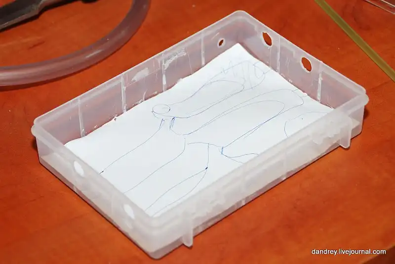 4. Срезал перегородки в коробке для бисера, вырезал отверстия для вентиляции, увлажнения и входа. Сделал эскиз внутренних помещений.