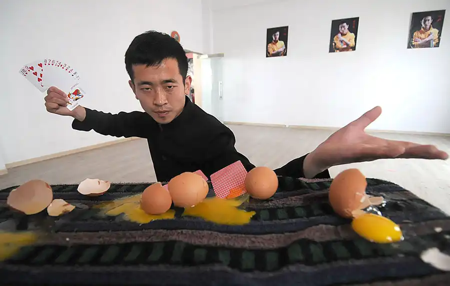 Двадцатитрехлетний гражданин Китая с непереводимым именем Bai Dengchun обладает суперспособностью, которой, практически каждый, очень хотел бы научиться. Он умеет кидать покерные карты таким образом, что они разрезают мягкие и не слишком мягкие предметы.