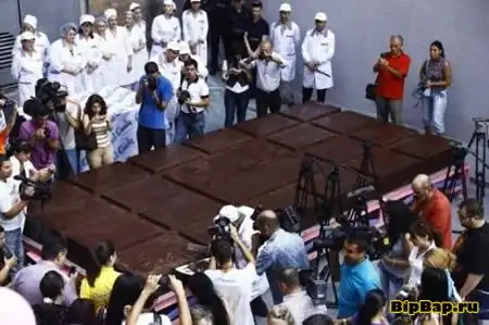 Вот уж точно мечта сластены. Американская компания Гранд Кэнди (Grand Candy) поставила мировой рекорд по размеру приготовленной шоколадки. Размер ее составляет 254 сантиметра, а вес 4 408 килограмма.