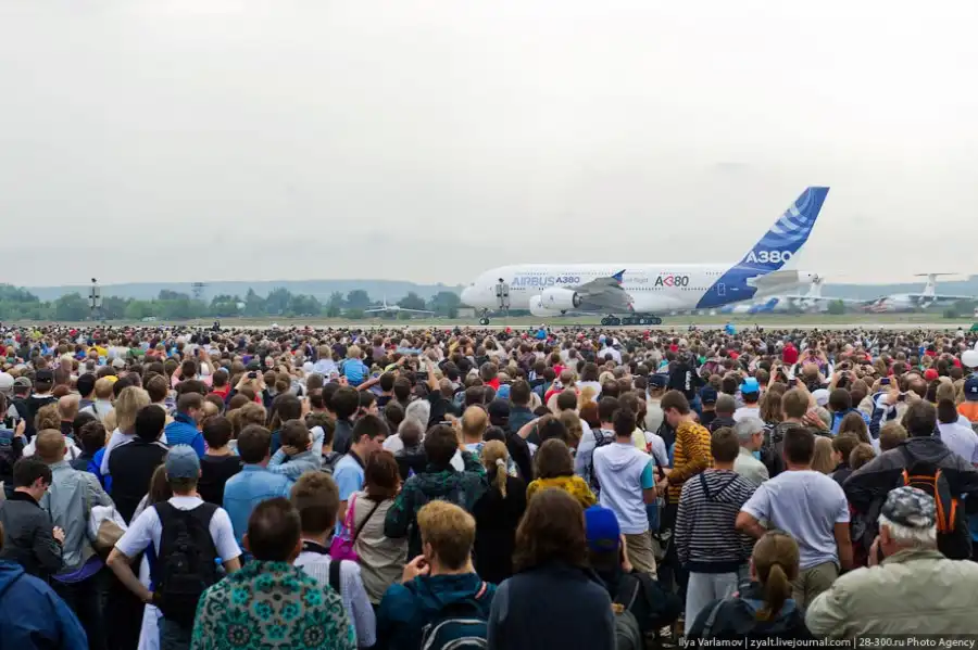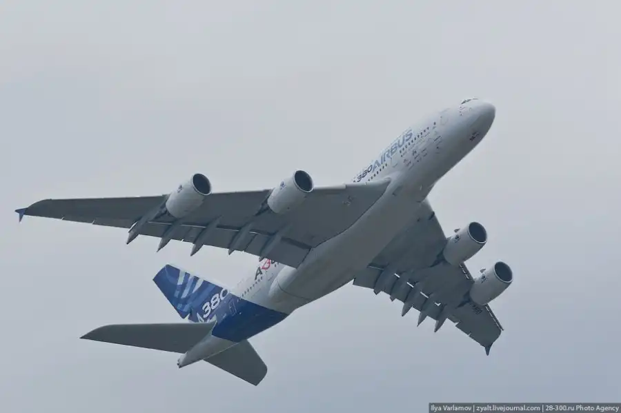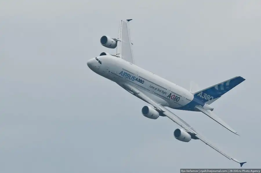Airbus А380 — широкофюзеляжный двухпалубный пассажирский самолёт — самый крупный серийный авиалайнер в мире. Его вместимость может доходить до 853 пассажиров в одноклассовой конфигурации, это значит, что он легко может перевезти всех учеников обычной московской школы или всех жителей поселка Высокий Яр. Самолет может совершать беспосадочные перелёты на расстояние до 15 400 км – это значит, что можно из Москвы в Сидней теперь лететь без пересадок. На разработку А380 ушло около 10 лет, стоимость всей программы — около 12 млрд евро. Airbus утверждает, что для возмещения затрат корпорации необходимо продать 420 самолётов.