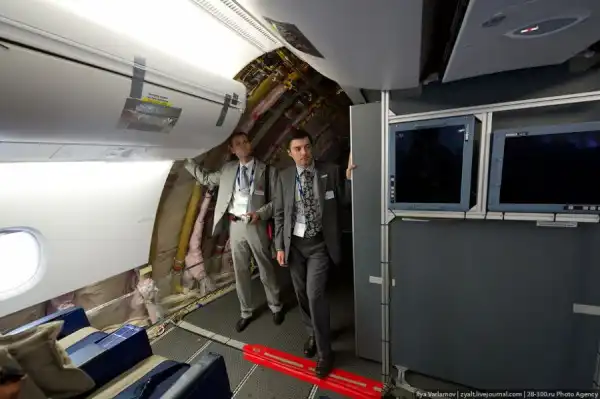Верхняя палуба немного уже, чем нижняя – на ней размещаются 8 кресел в ряд, вместо 10. Она соответствует размерам самолета А330.