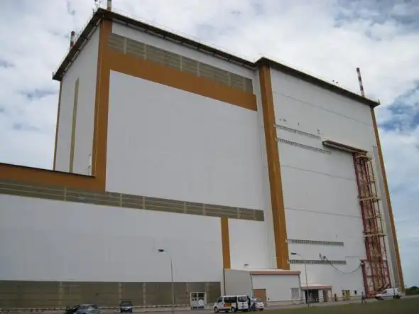 Это здание BIL. Здесь собирают ракету-носитель Ариан-5. Полностью. Без головной части (спутника). По принятым здесь нормам ракету собирают и транспортируют к месту запуска в вертикальном виде. Нам разрешили подойти к Ариану-5. По бокам — твердотопливные ускорители. Посередине — основная часть (заправляется жидким топливом)