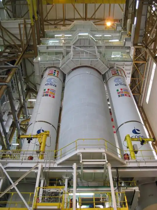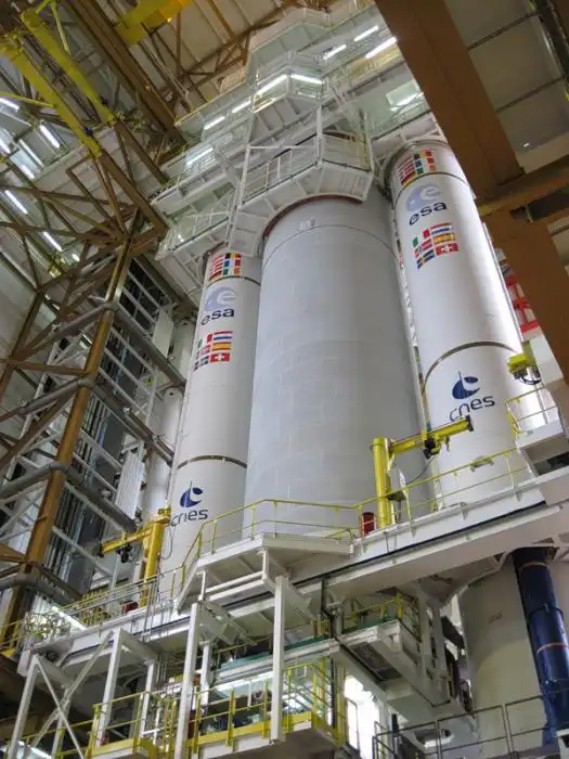 Дальше Ариан-5 — опять же в вертикальном виде перевезут в другое здание. Присоеденят спутник (головную часть) и отправят на стартовый комплекс. Пока он пустой.