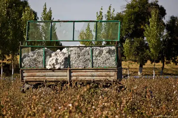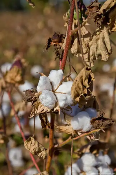 Перед сбором урожая на поля перестают подавать воду. Поэтому хлопчатник засыхает. Сама «вата» созревает в так называемой коробочке. На этой фотографии коробочка рассохлась и раскрылась (возможно в обратном порядке).