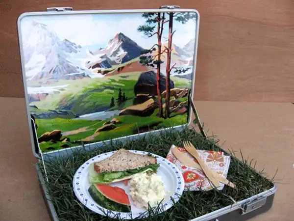 А для самых ленивых желающих устроить пикник на природе дизайнеры придумали один очень хитрый девайс. Называется он Picnic in a Suitcase, поскольку весь тот красивый пейзаж, который можно увидеть в горах, в лесу, на пляже или в поле, компактненько уместился в один маленький чемоданчик. В нем есть трава и картинка с изображением того места, где проходит "отдых на природе", и при желании, место пикника можно одним махом сменить на более подходящее. Вместо травы насыпать в чемодан песка и ракушек, а в качестве пейзажа выбрать фотографию моря с чайками. Или же фотографию горных вершин, а вместо песка - камешки разных размеров...