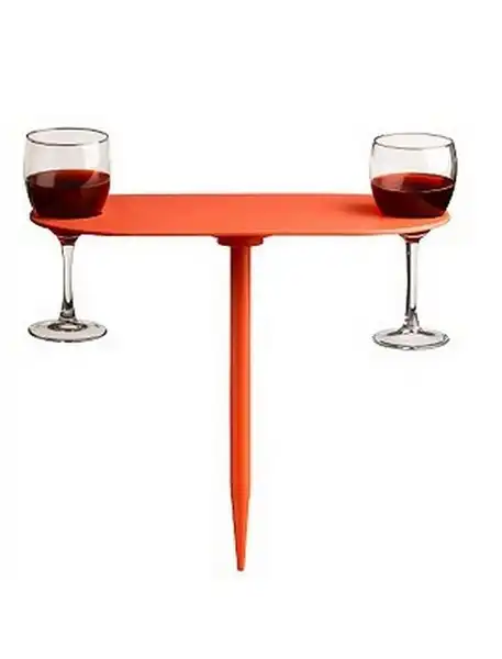 Уж не знаю, многие ли ездят на пикник со стеклянными бокалами для вина, но если этот пикник - что-то вроде романтического отдыха на природе с любимым человеком, то без них не обойтись. А поскольку ставить бокалы с вином на траву или землю, во-первых, неудобно, ведь напиток может пролиться, а во-вторых, опасно, ведь непонятно какая мелкая живность может залететь внутрь, существует мини-столик специально для этих целей. Для двух бокалов вина и романтического пикника. Будучи вкопанным в землю, этот столик уж точно не опрокинется, стало быть, вино и бокалы - в безопасности.
