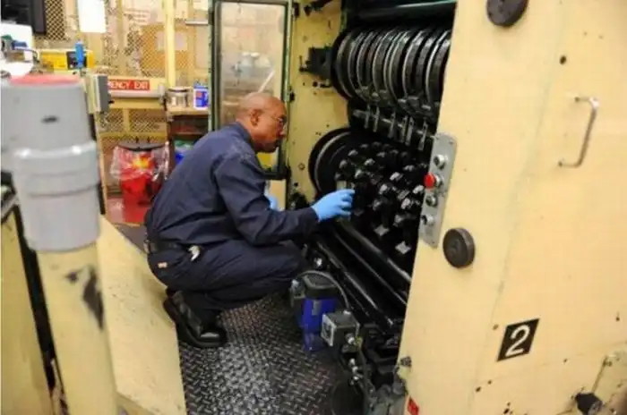 Уильям Болден налаживает машину по нанесению печатей казначейства на банкноты.