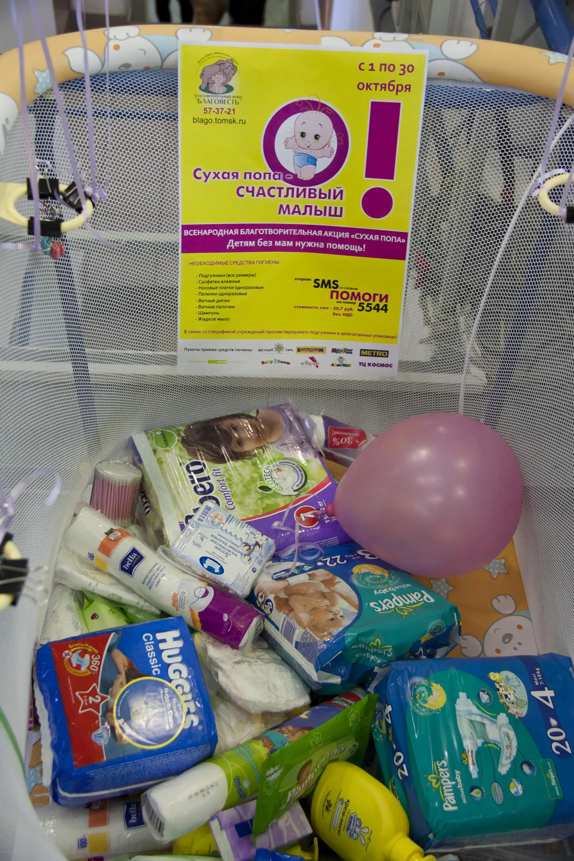 Акция "Сухая попа" будет продолжаться до 31 октября и все желающие смогут принять в ней участие (купить и передать пачку подгузников в пункты приема, или перечислить на счет фонда 30р. через смс на номер 5544). Подробности на сайте фонда "БлаговестЪ": www.blago.tomsk.ru или по т. 57-37-21