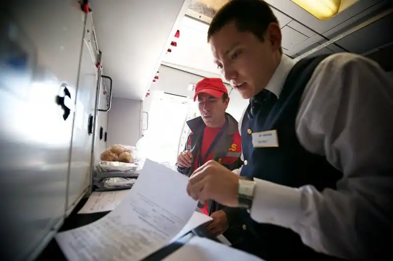 26. Когда все дела сделаны, у бригады есть время поесть. Питание для бортпроводников привозят отдельно. Если пассажир за короткое время перелета просто перекусывает, то у стюардов сейчас время обеда, после которого они целый день снова на ногах