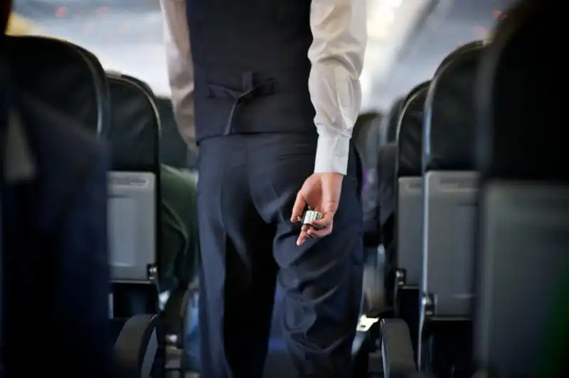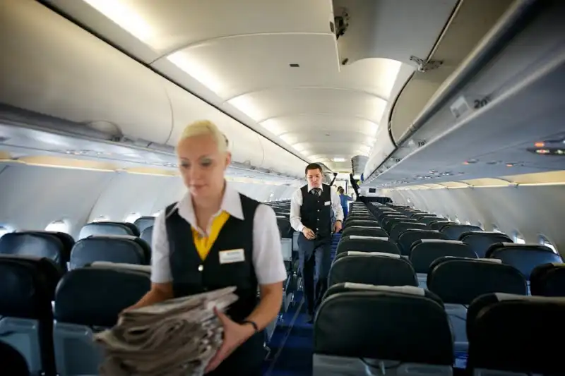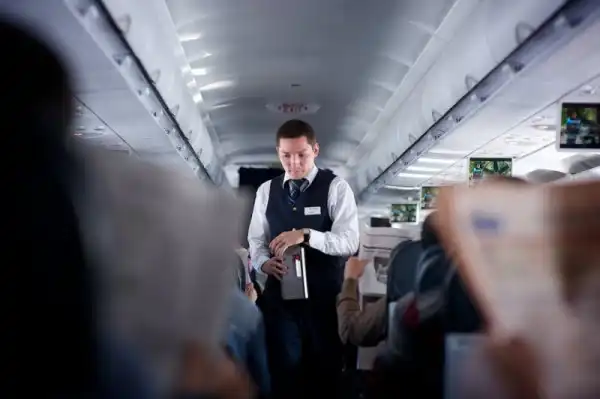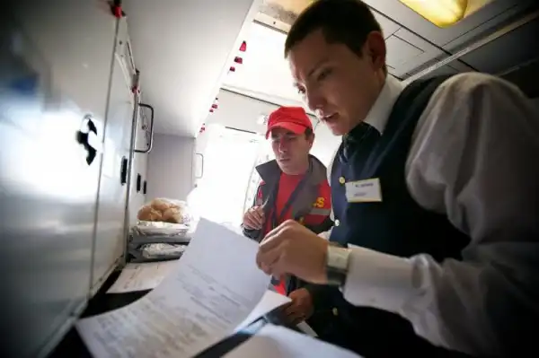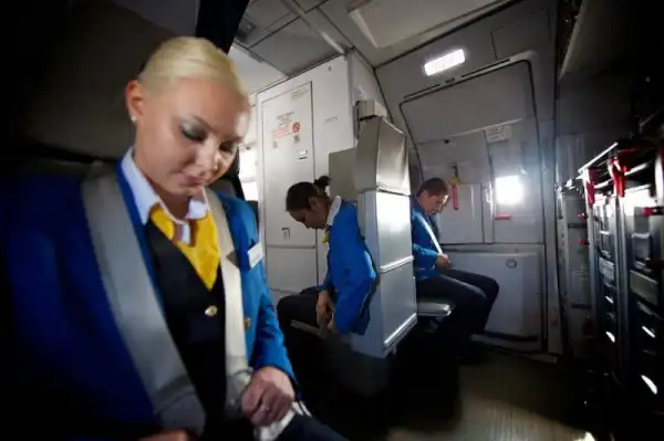 8. Через час в специальном зале для брифинга должна встретиться вся бригада, где старший бортпроводник проверяет документы, всех инструктирует, распределяет обязанности, проверяет предполетную документацию бортпроводников, знания спецкоманд, уточняет место каждого из членов экипажа на борту и проверяет их внешний вид