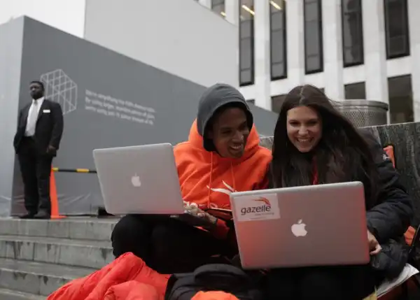 Кинен Томпсон и Джессика Меллоу сидят в сети, ожидая своей очереди, чтобы купить iPhone 4S в магазине Apple Store на 5-й авеню в Нью-Йорке, 13 октября 2011 года.