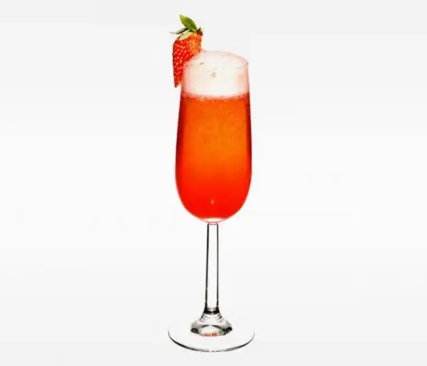 Измельчите клубнику, добавьте персиковое пюре, ликер и сироп. Взбейте и вылейте в фужер, залив сверху шампанским. Украсьте ягодой клубники. Сладость коктейля смягчит едкость даже самого дешевого шампанского, а клубника выдаст бонус в виде половины рекомендуемой дневной нормы витамина С.