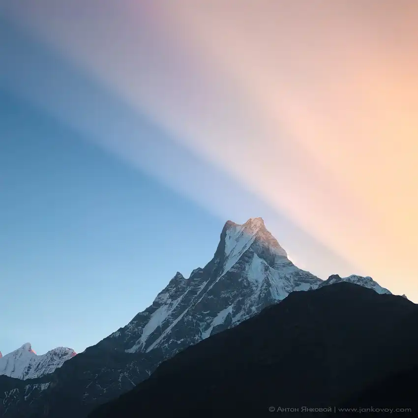 На фото гора Machhapuchhre в первых лучах рассветного Солнца, снято из посёлка Chhomrong (2210 m).Здесь чётко видно "хвост".