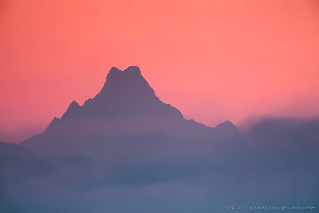На фото гора Machhapuchhre в первых лучах рассветного Солнца, снято c Pool Hill (3210 m)