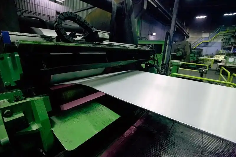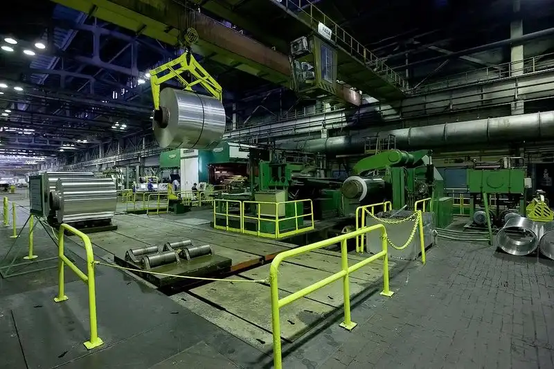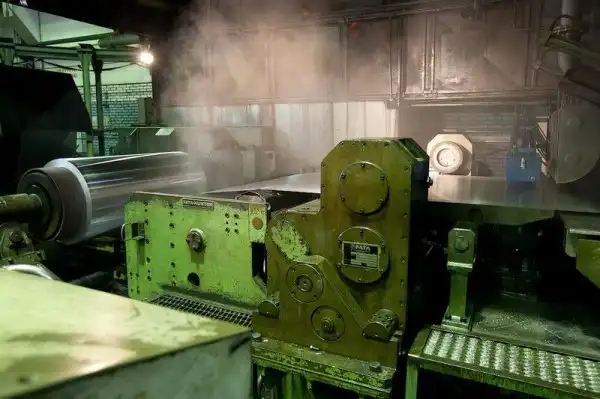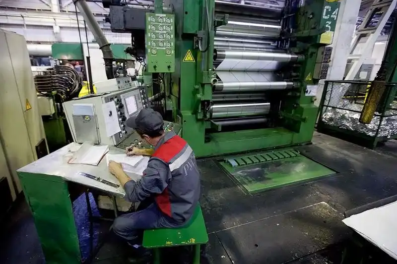 В цехе установлено несколько станов холодного проката алюминия «FATA Hunter». С каждым проходом через стан алюминиевая лента становится всё тоньше.