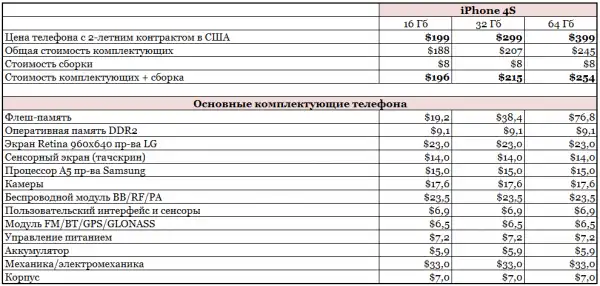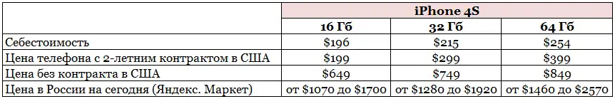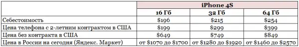 Итак, себестоимость нового iPhone 4S составляет $196, $215 и $254 в зависимости от объема памяти. «Цена телефона с 2-летним контрактом в США» — это по-нашему первоначальный взнос при покупке в кредит, и при этом еще нужно быть гражданином Америки.