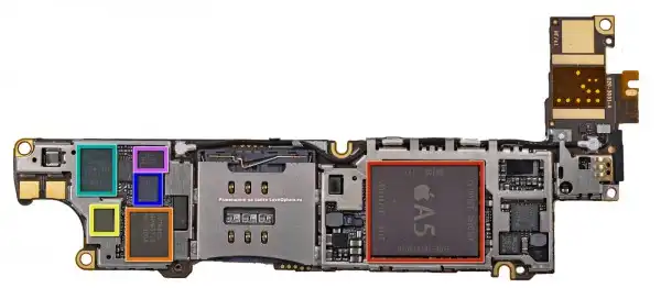 Это самая главная часть — материнская плата телефона с новым процессором A5 производства Samsung. Любители электроники могут рассмотреть ее более подробно. (Кликабельно, 1600×700 px):