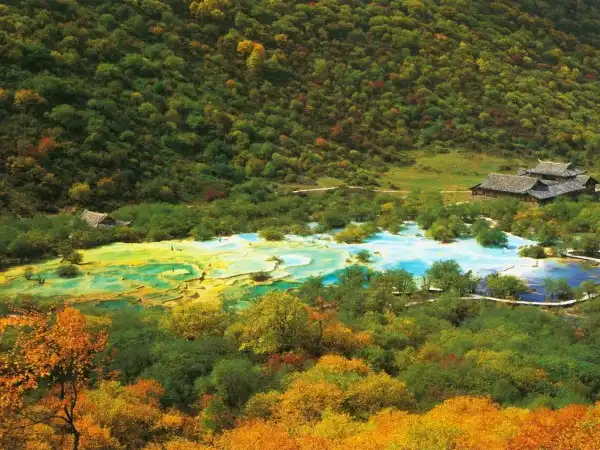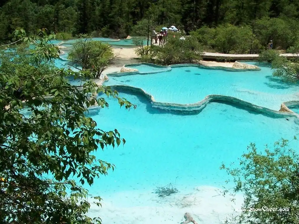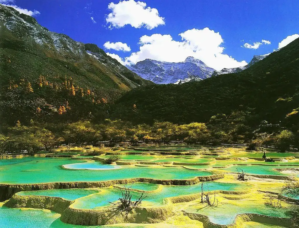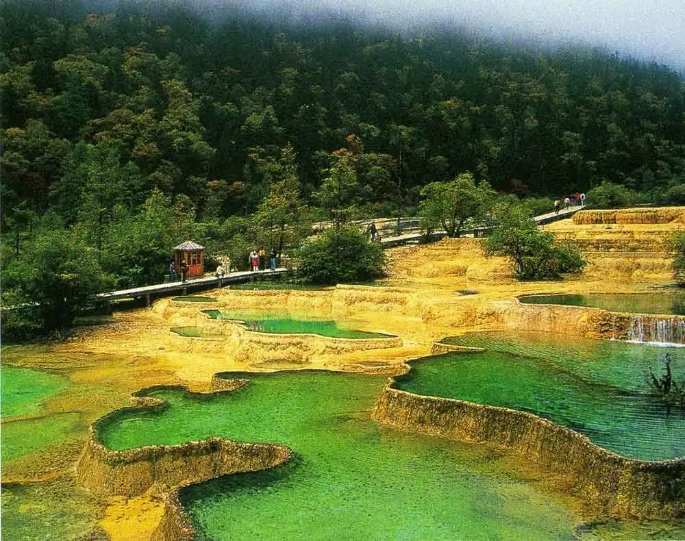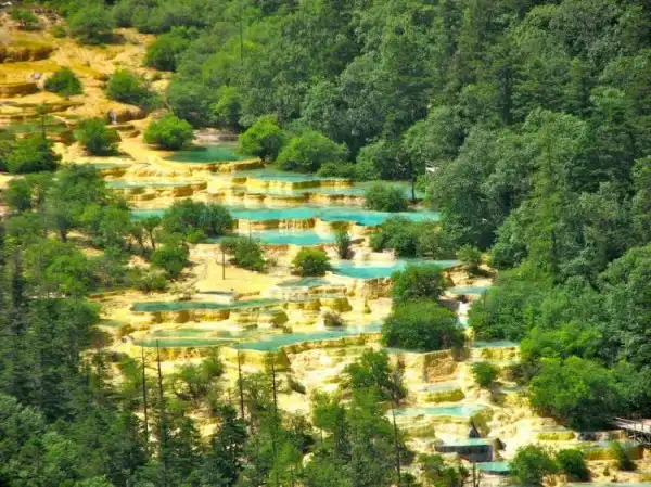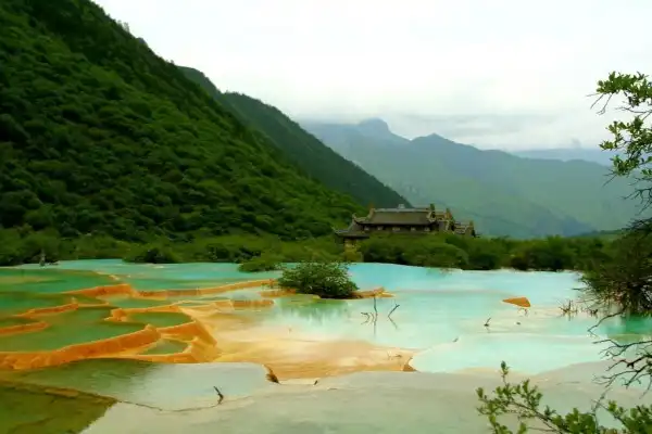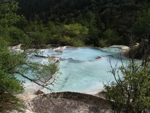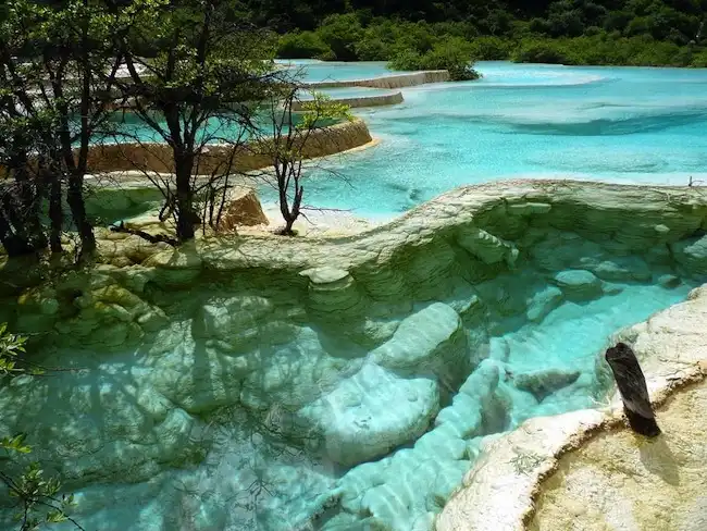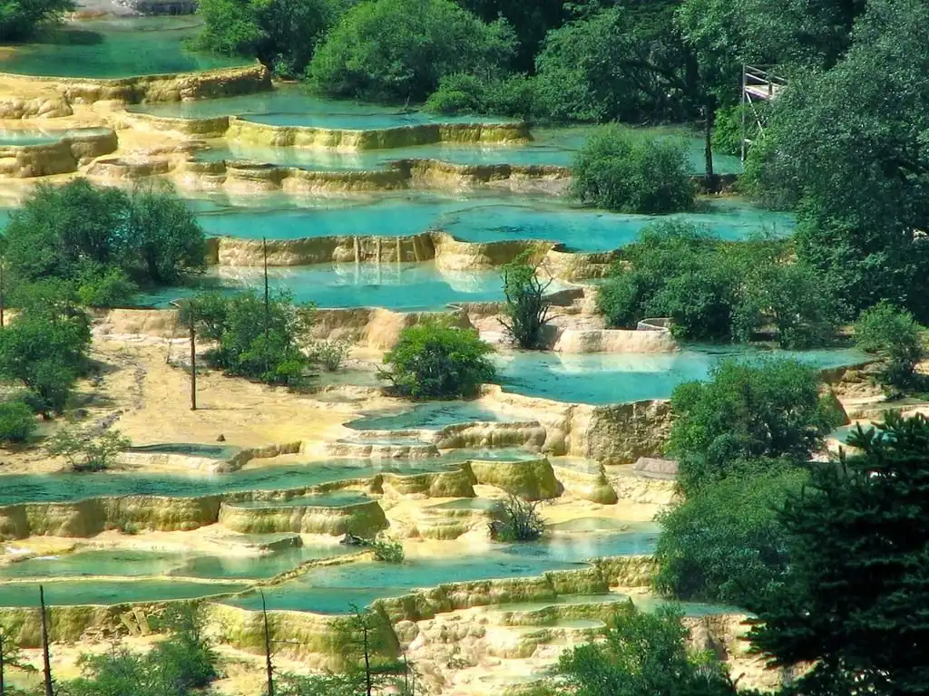 На высокогорье провинции Сычуань в Китае находится живописнейший заповедник Хуанлун. Здесь расположены высокогорные долины, скованные тысячелетними ледниками, водопады и термальные источники. Но главной изюминкой и красивейшей достопримечательностью Китая в Хуанлун являются травертиновые ландшафты. Им же Хуанлун и обязан своим названием, что в переводе с китайского означает «Желтый Дракон».