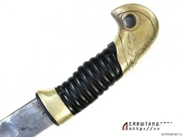 Клинок с двумя узкими долами, у основания клинка с оборотной стороны - орнаментальный травленый картуш с Государственным гербом и надписью "Златоустъ Ор. Фабр.". Черен рукояти изготовлен из черно-коричневой кости, прибор рукояти - из серебра 84 пробы, украшен уставным черненым растительным орнаментом.
