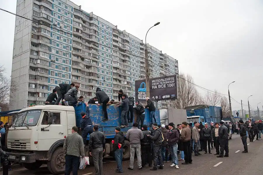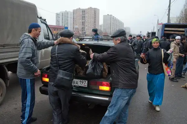 Вся улица практически от метро с обеих сторон заставлена грузовиками и "Газелями" с живым товаро