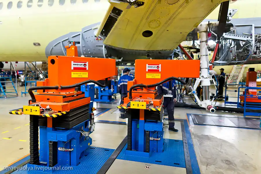 SSJ100 - первый русский самолет, стыковка которого производится автоматически. Фюзеляж самолета выравнивают, а крылья поднимают на специальных домкратах. Все выравнивается с помощью лазера, после чего происходит стыковка и крепление крыла к фюзеляжу: